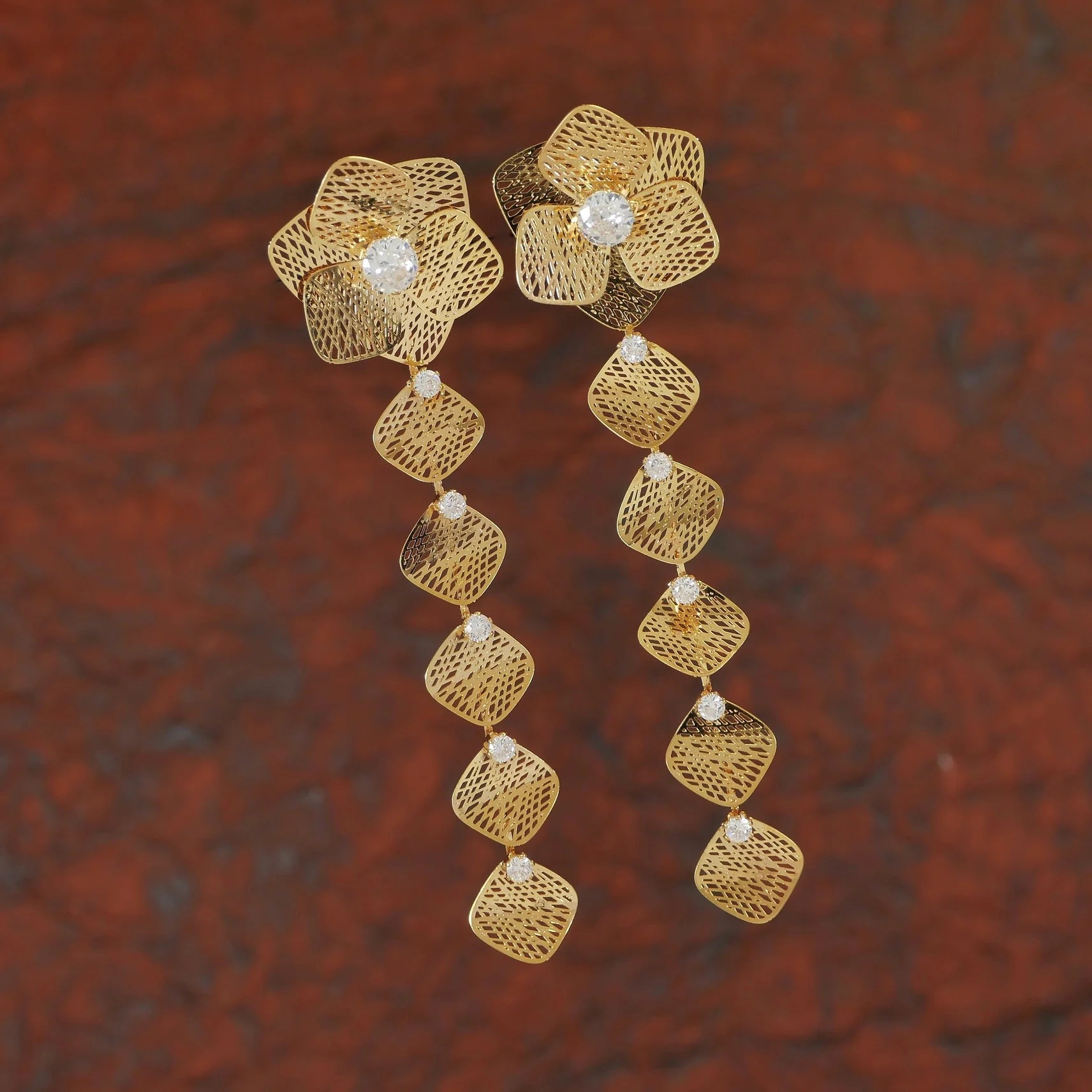 Drape your ears in pure grace with the Golden Cascade Bloom Earrings. Crafted with delicate golden mesh petals and accented by shimmering white stones, these earrings flow down in a mesmerizing floral-to-diamond pattern. Lightweight yet statement-worthy, they are perfect for festive events, dinner dates, or any time you want to make an unforgettable impression.